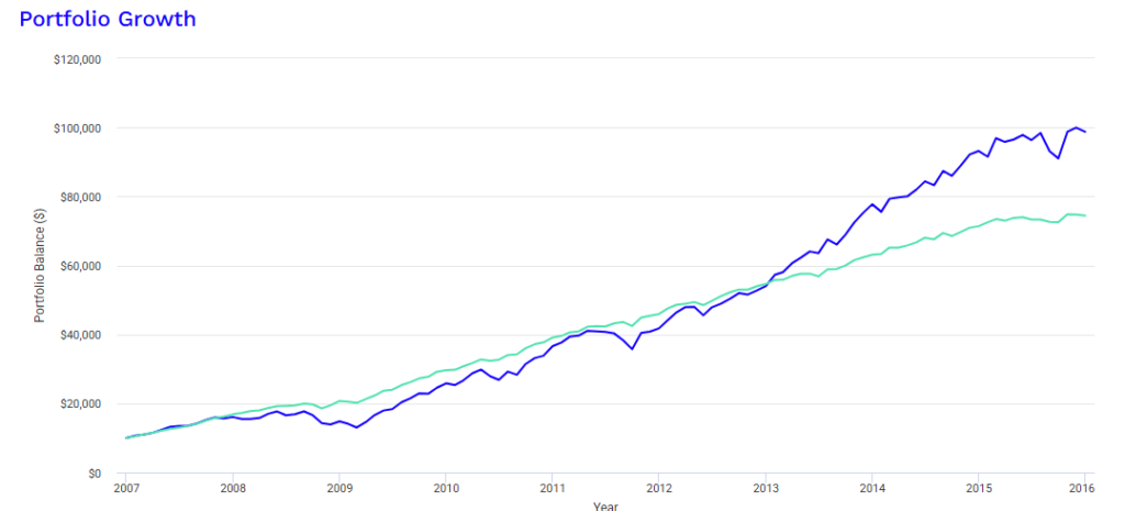 データの取れる2007年から2015年までのデータを抽出してみると、2013年頃までは「オールシーズンズポートフォリオ」の方が成績が良かったことがわかります。やはり、安定した運用成績を残してくれている印象です。