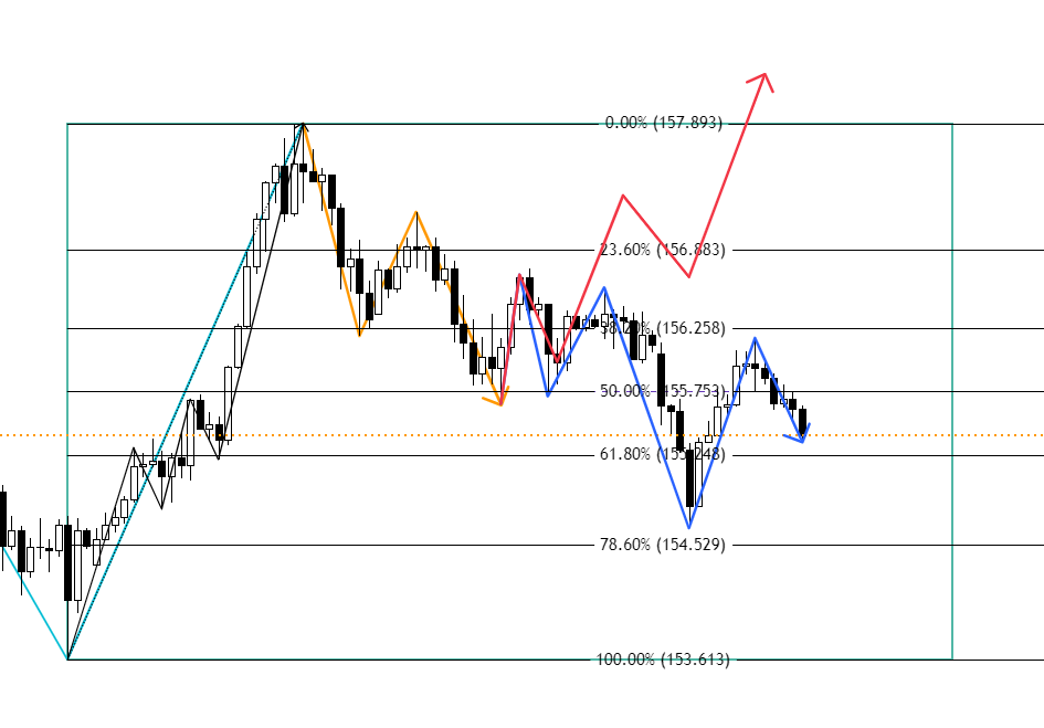 週末の環境認識時点で見えていた形がオレンジ色の波形で、理想形が赤い波形です。