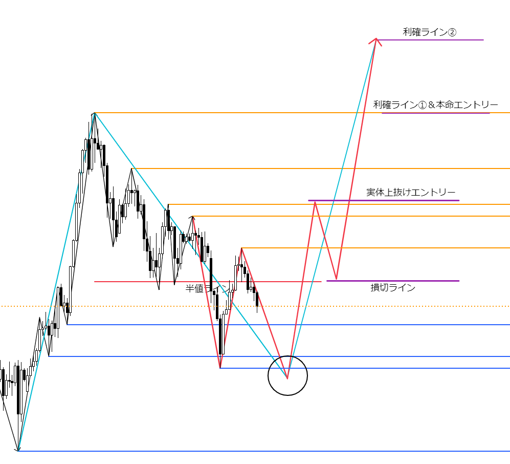 本命のロングエントリーポイントは、一番上のオレンジ水平線を実体で上抜けたときです。