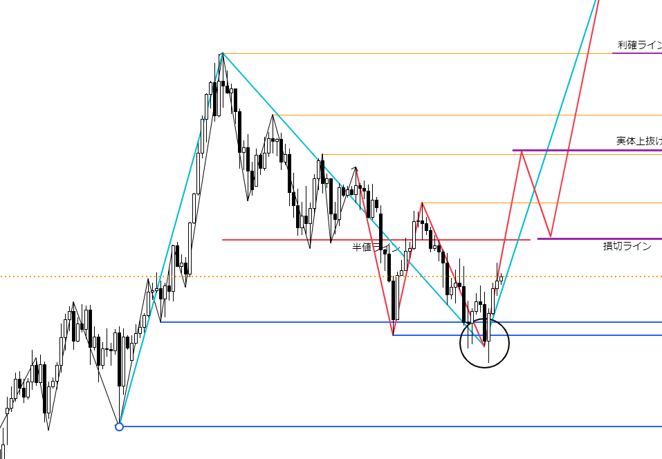 前回と変わらず、オレンジboxを上抜けして、推進波と同じ方向(上昇トレンド)になってから、上昇3波を待ってエントリー