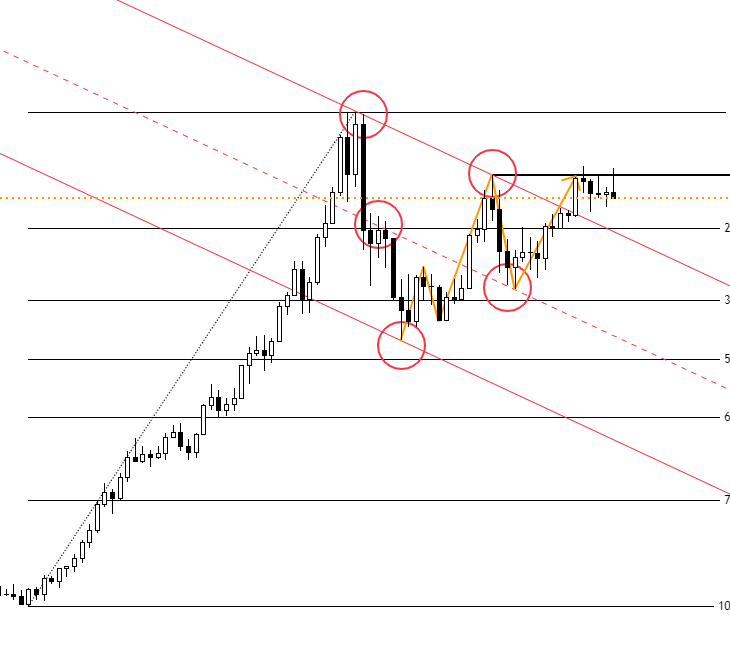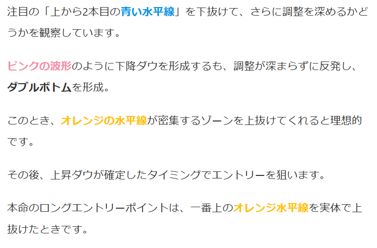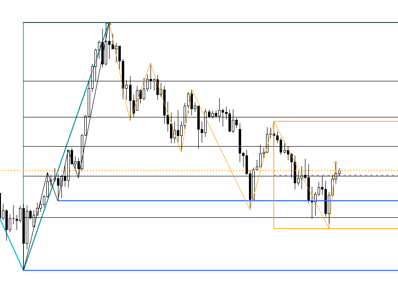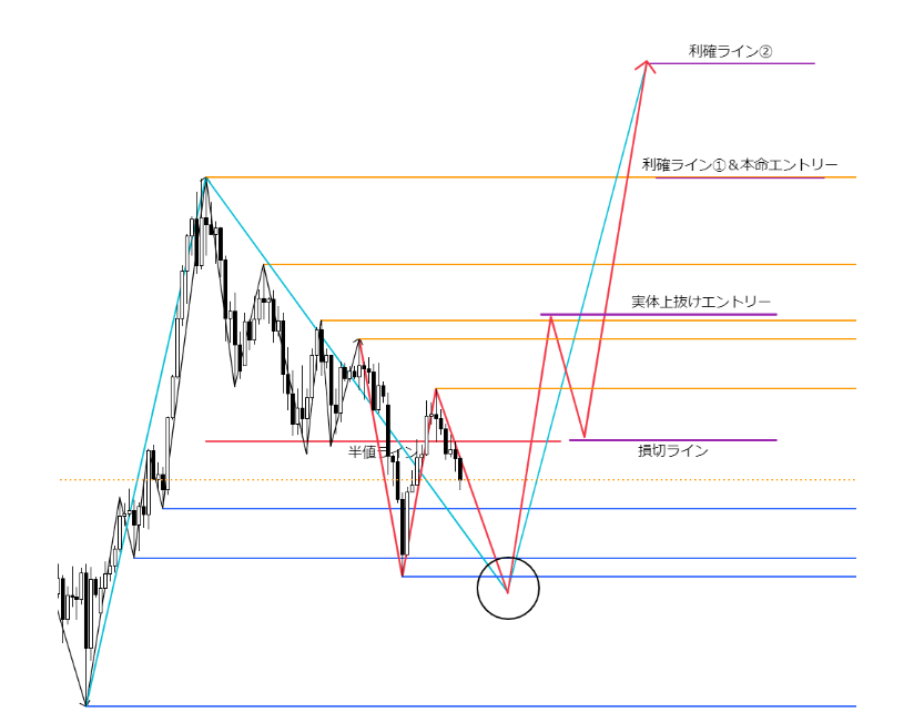 青色水平線を下抜けして下降トレンド継続した(オレンジ線)