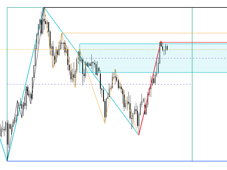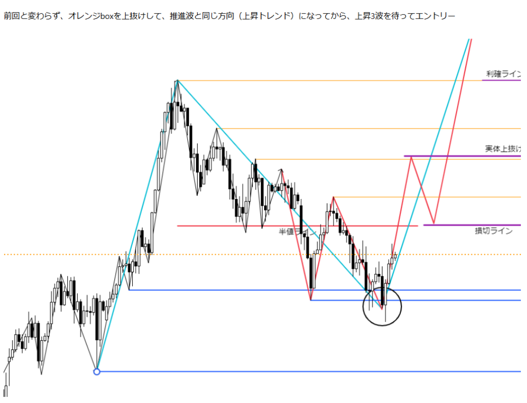 前回のシナリオ波形に非常に近い形で動いており、現在までにオレンジ色波形の戻り高値2本と水色上昇波形に対する23.6%から構成されるBOXで示した抵抗帯を一気に抜いています。