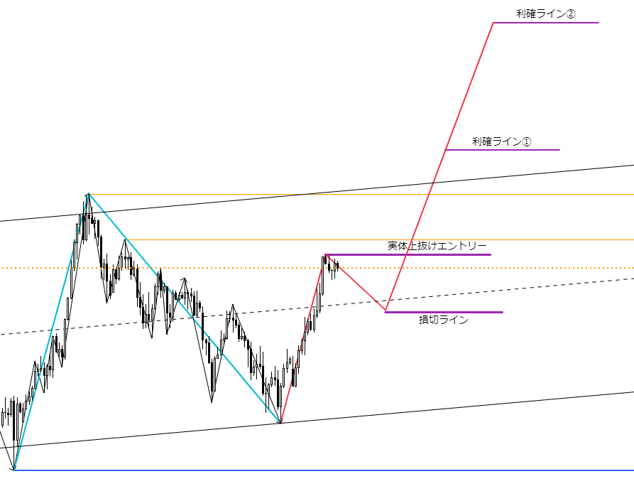 3波の力を使って、残りのオレンジ色の戻り高値2本を抜いて、さらにチャネル上辺を抜けるとなると相当のエネルギーを使うはずです。