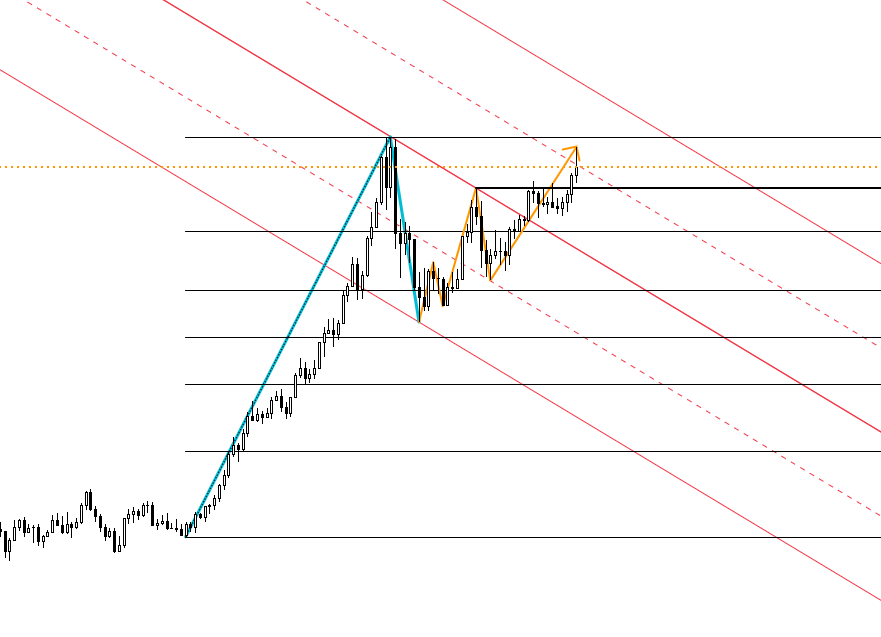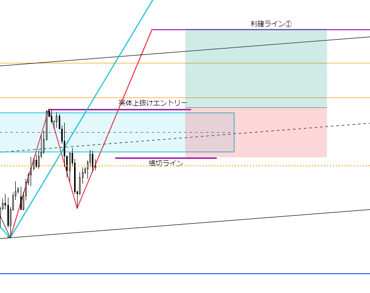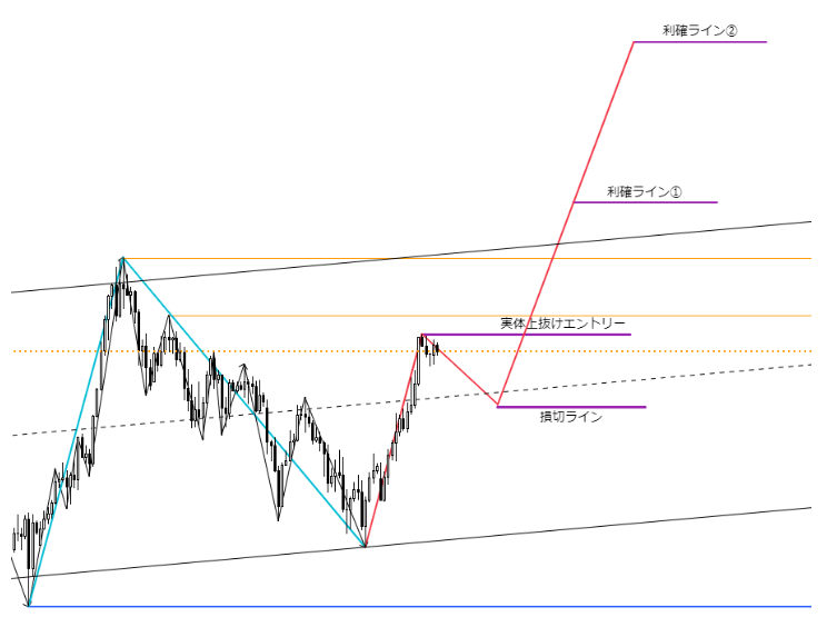 抵抗ラインがオレンジ水平線2本とチャネルラインがあるので、利益が出始めたら早めに建値よりも上に撤退注文を入れていきます。