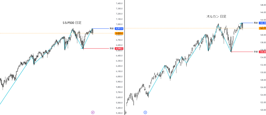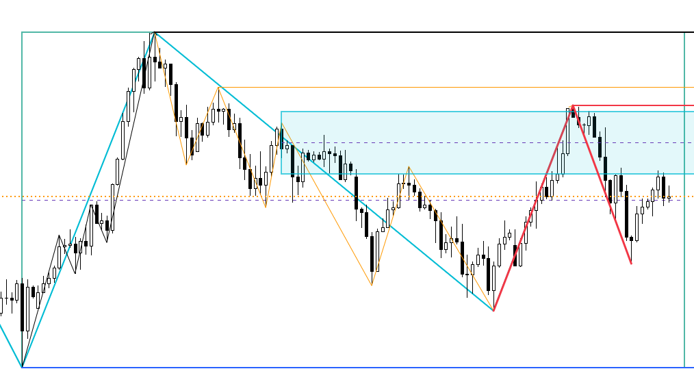 反対に、オレンジ色の太い水平線を下抜けると調整波が下降トレンド転換