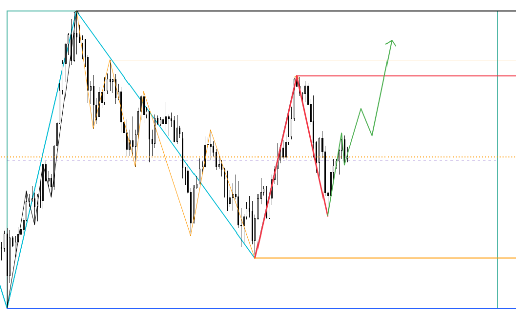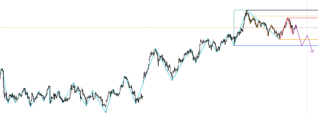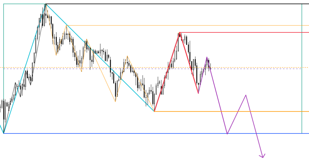 日足:オレンジが日足調整波、紫波形は4時間足下降トレンド波形