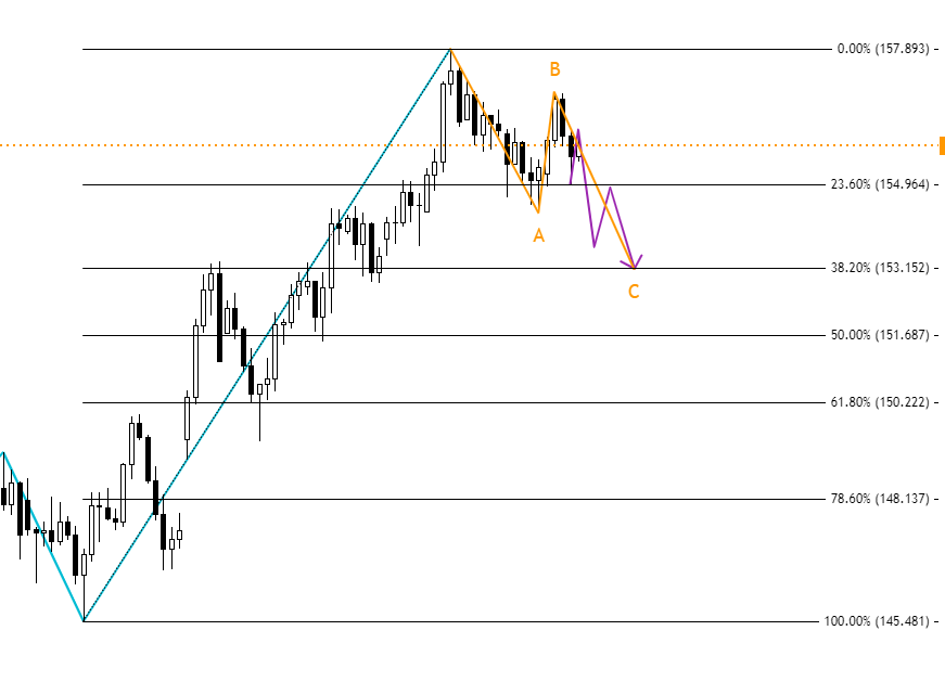 下のチャートは日足ですが、4時間下降3波は日足の調整波にあたりそうです。38.2%や50%から反発する可能性があります。