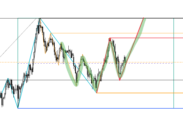 赤色波形(調整波):上昇トレンド 上昇ダウ待ち