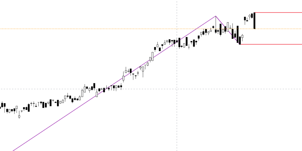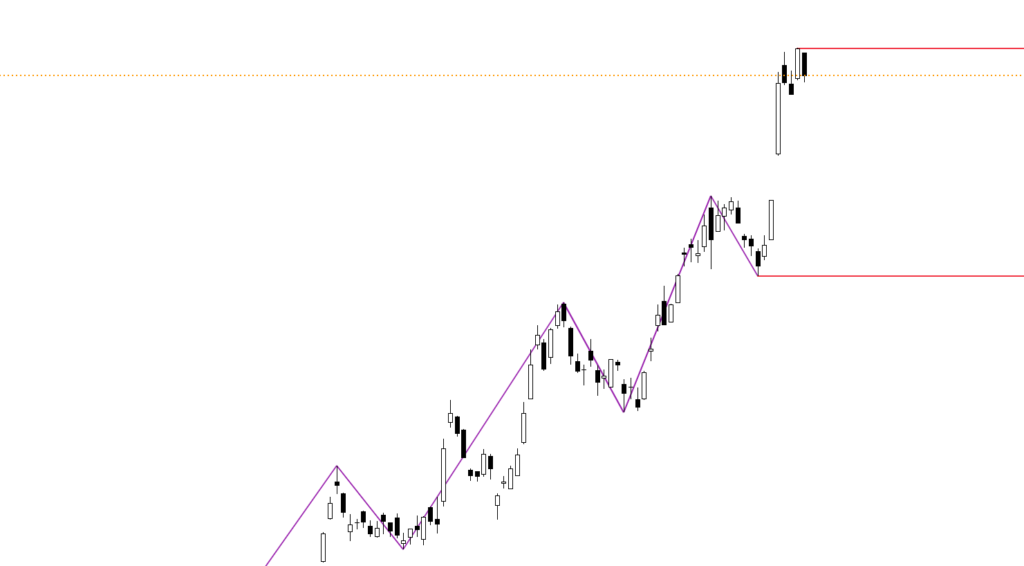 日足チャートに「ZigZag」というインジケーターを追加しています。安値と高値に赤線を引いています。