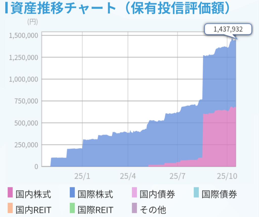 株式多めですが、債券やリート(不動産)、ゴールドにも分散しており、ライフステージに合わせて資産配分を変えられるようにしています。