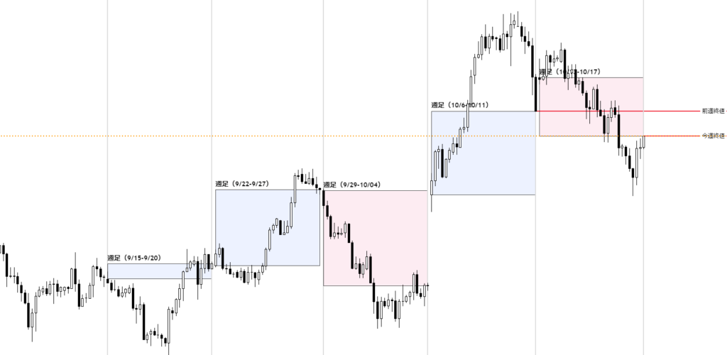 4時間足チャートに週足のローソク足(実体部分)を重ねてみると、今週も大きな窓開けで始まり、勢いよく上昇する展開が見られました。しかし、火曜日以降はドル安・円高方向へ転換し、金曜日の終値にかけて再び円安・ドル高方向へ戻ってきました。