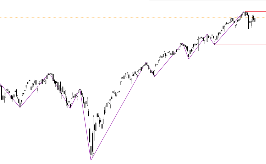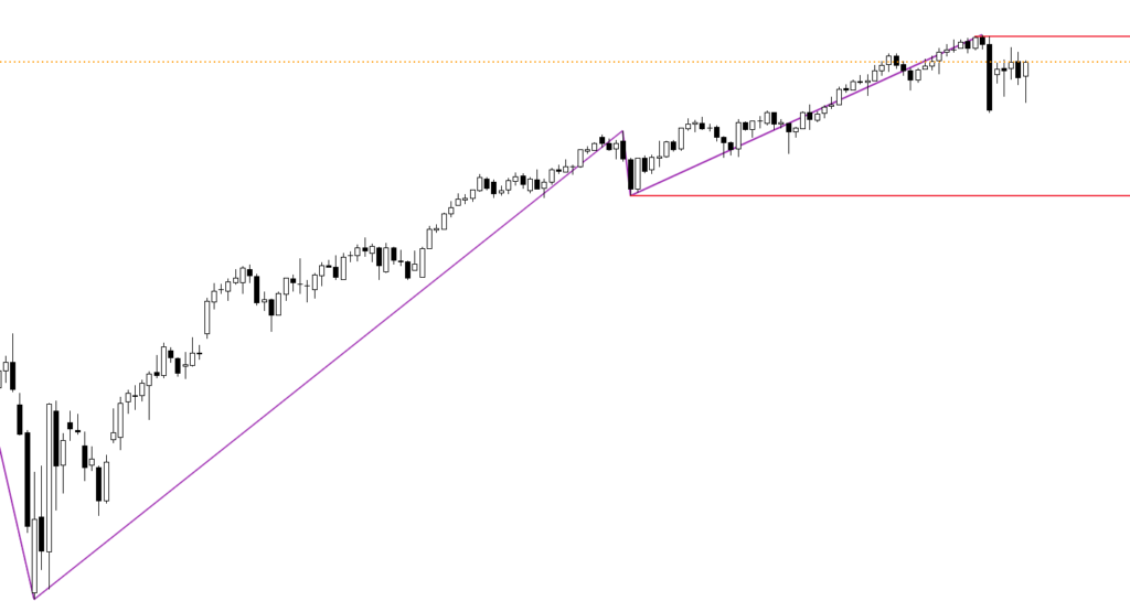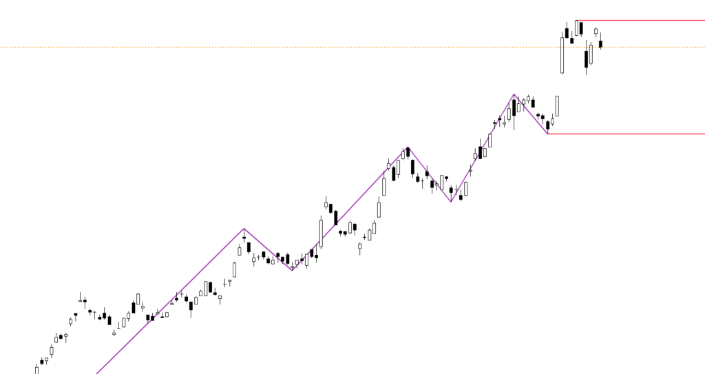 日足チャートに「ZigZag」というインジケーターを追加しています。安値と高値に赤線を引いています。