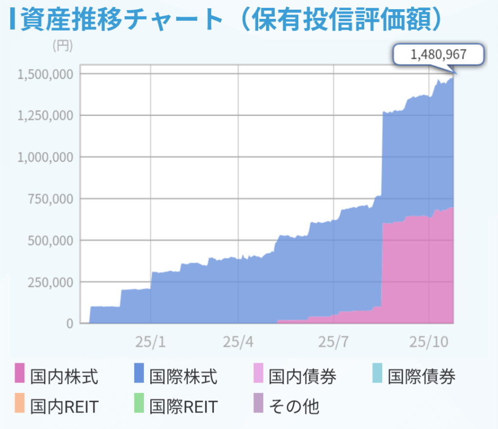 株式多めですが、債券やリート(不動産)、ゴールドにも分散しており、ライフステージに合わせて資産配分を変えられるようにしています。