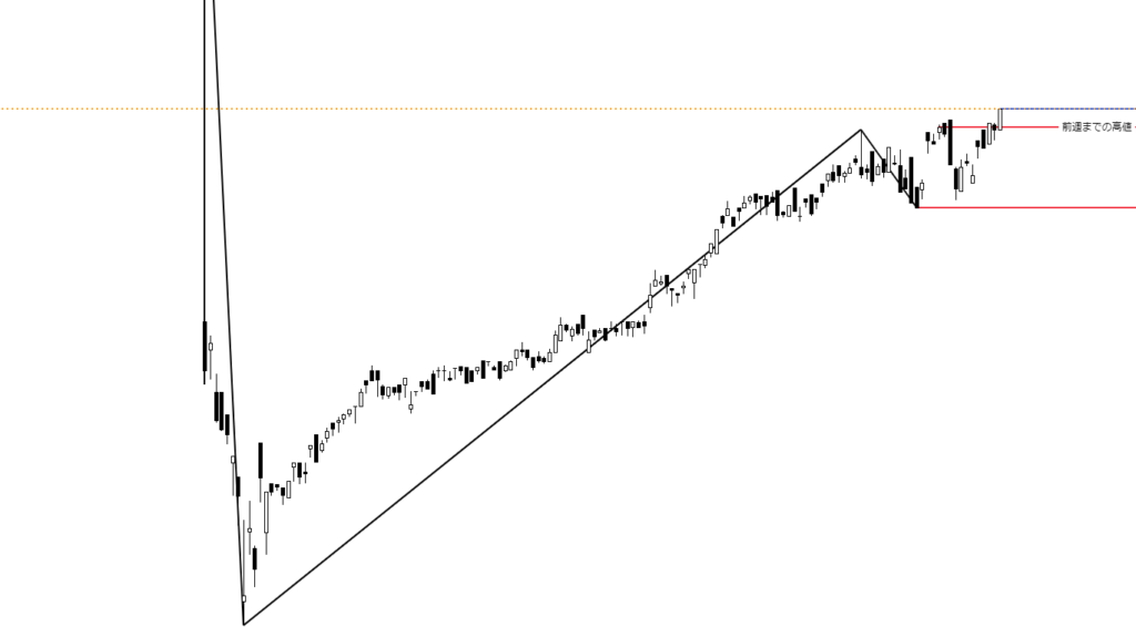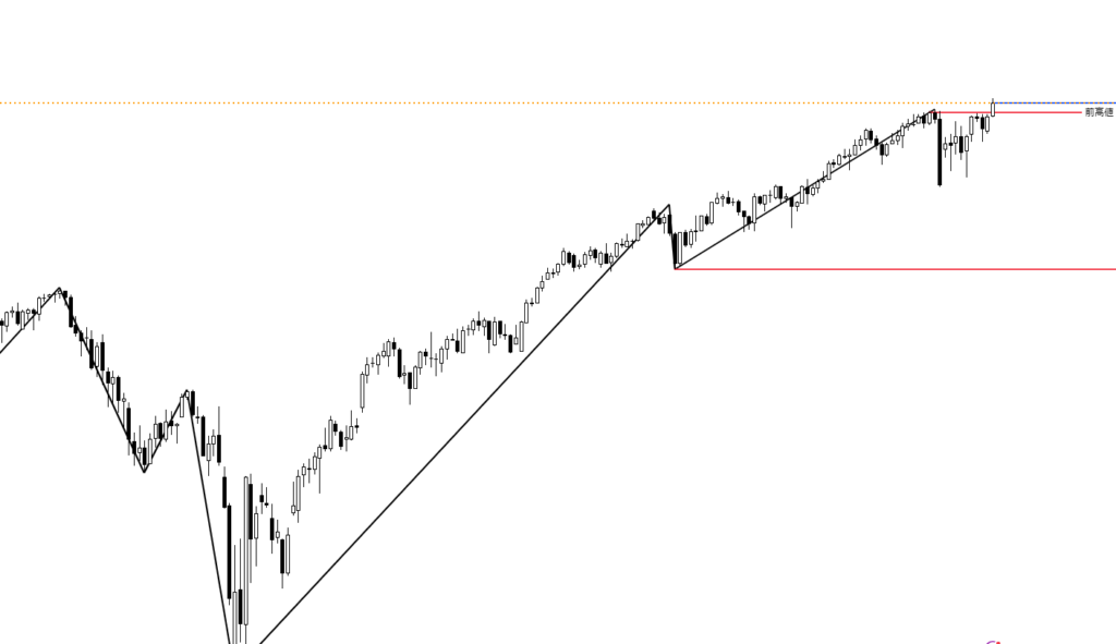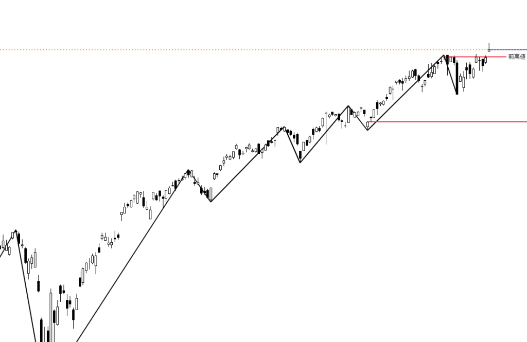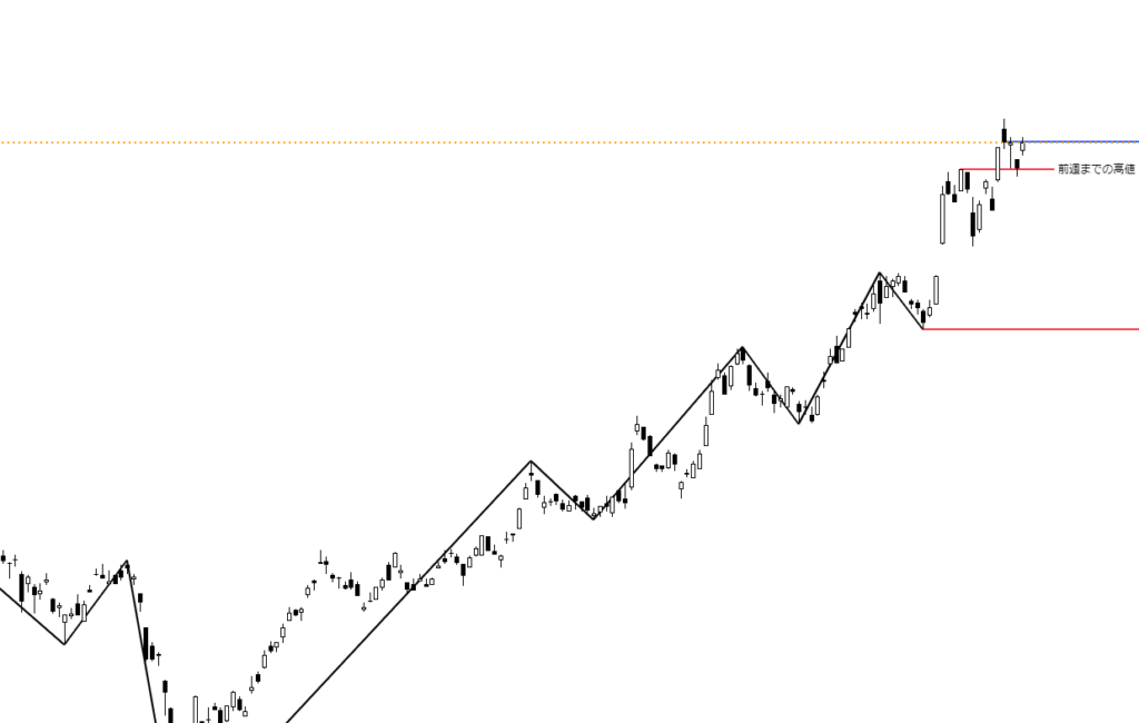 日足チャートに「ZigZag」というインジケーターを追加し、安値と前週までの高値には赤線、今週形成された高値には青線を引いています。終値ベースでは、4万9316円が新たな高値となりました。