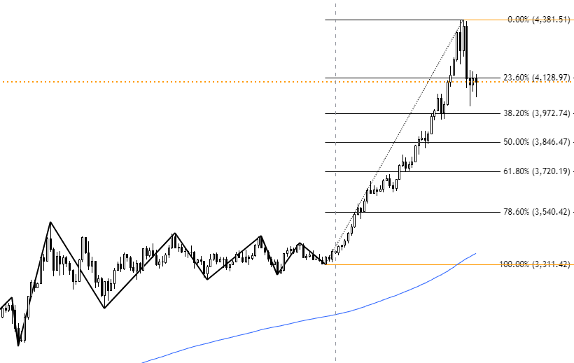 日足チャートに『ZigZag』と『200EMA』、そしてフィボナッチ・リトレースメントを表示しています。フィボナッチの反応具合から、この価格帯で観察しているトレーダーが多いと考えられます。現在は23.6%の水準に位置しており、調整としてはまだ浅い段階です。また、200EMAからも大きく乖離しているため、調整途中である可能性が高いと見ています。