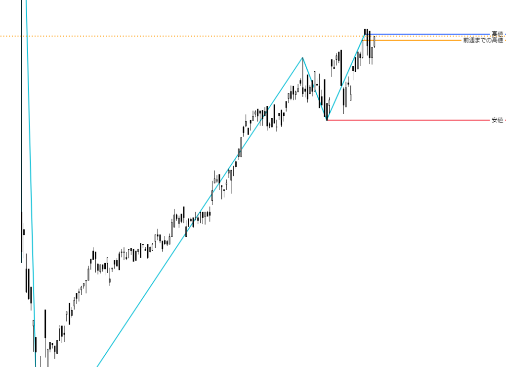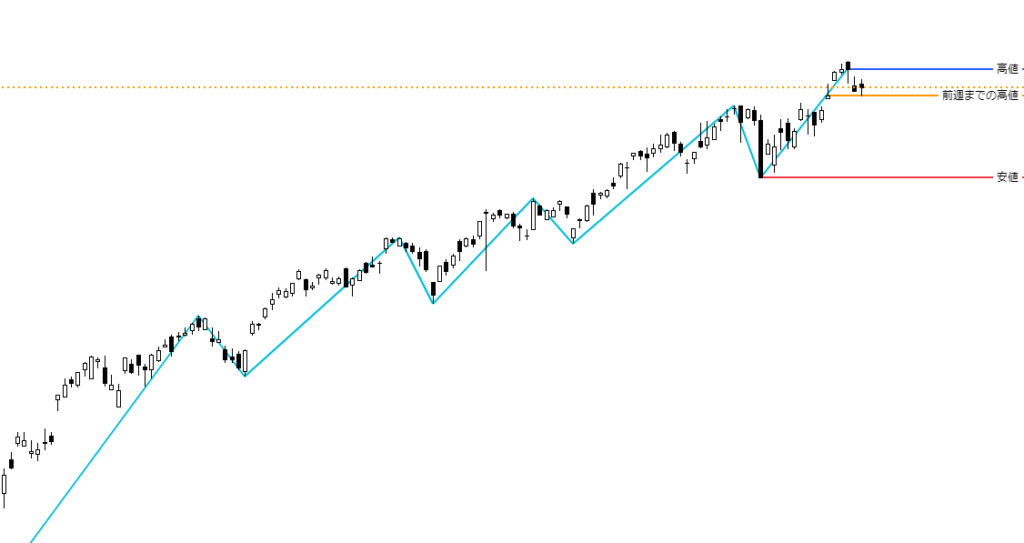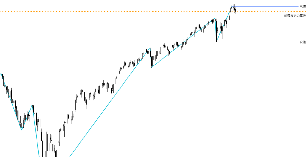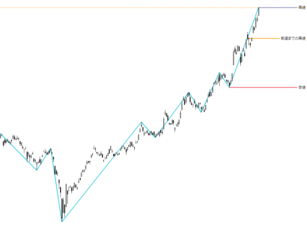 日足チャートに「ZigZag」インジケーターを表示し、安値を赤色、前週までの高値をオレンジ色、今週更新した高値を青色で示しています。終値ベースでは、5万2,411円が新たな高値となりました。