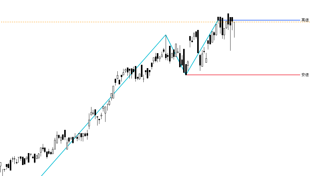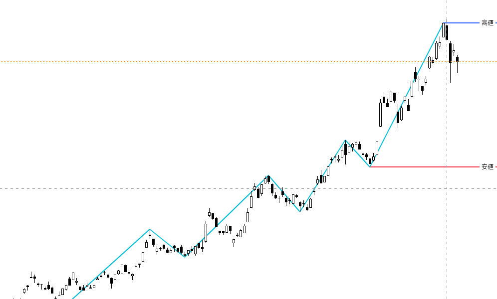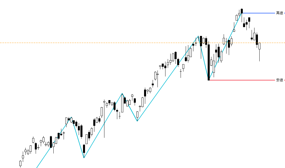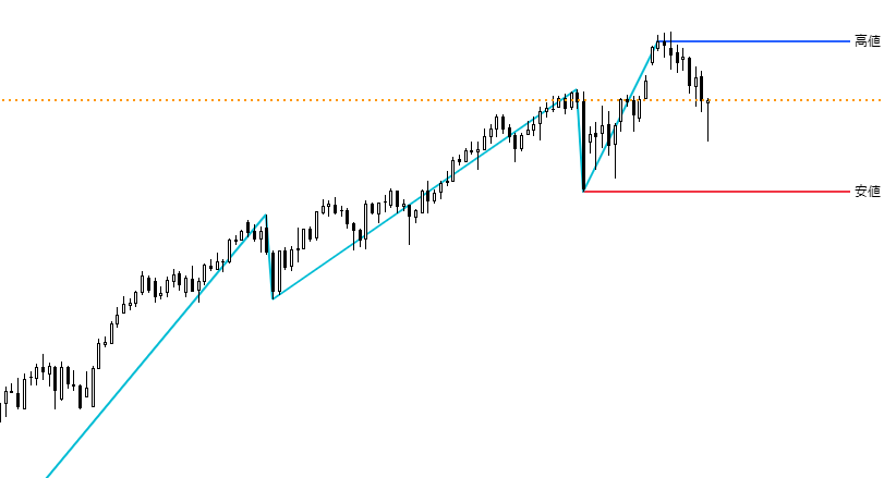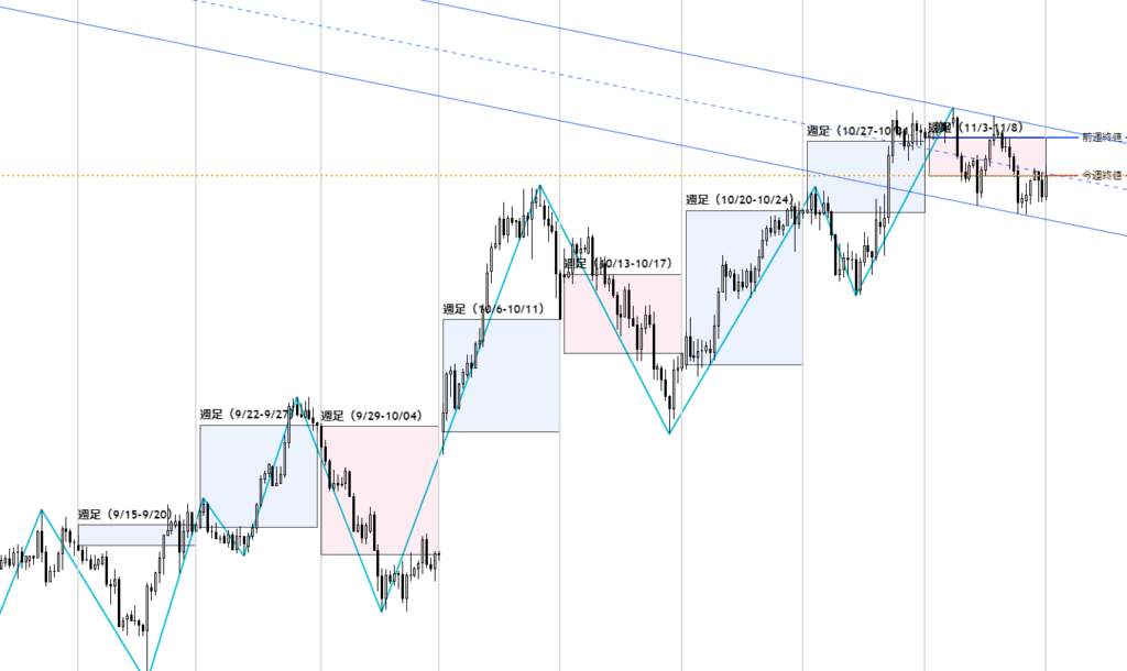日足チャートに「ZigZag」インジケーターを表示し、安値を赤色、高値を青色で示しています。今週は調整の一週間となりました。
