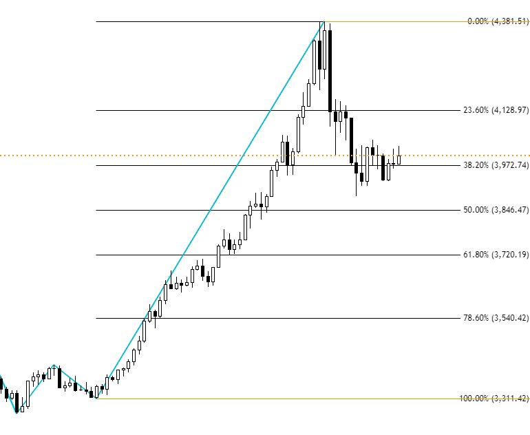 直近の力強い上昇波形に対してフィボナッチ・リトレースメントを適用すると、修正波は38.2%および50.0%の水準で綺麗に反応しています。いわゆる「半値戻し」と呼ばれる現象ではないでしょうか。この価格帯を意識しているトレーダーが多いことを示唆しているようです。