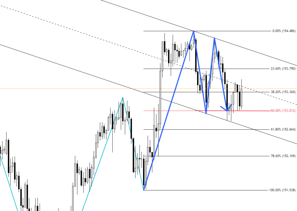 また、陽線の高値同士を結んで引いたチャネルの下限に、ローソク足のヒゲ先がタッチし、実体部分は50%の水準よりも上にとどまっています。典型的なダブルボトムを形成しているような印象を受けます。点線で示した半値にも反応しており、非常に機能しているチャネルだと考えられます。