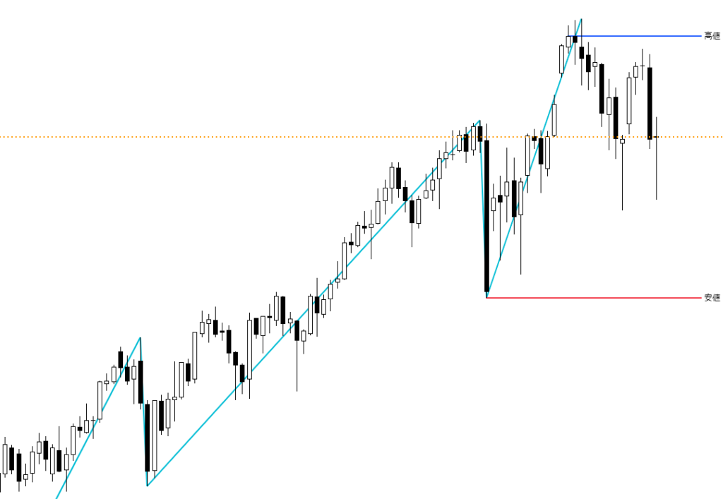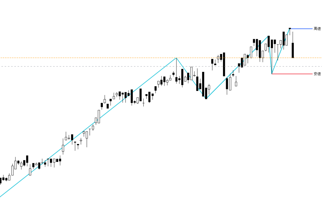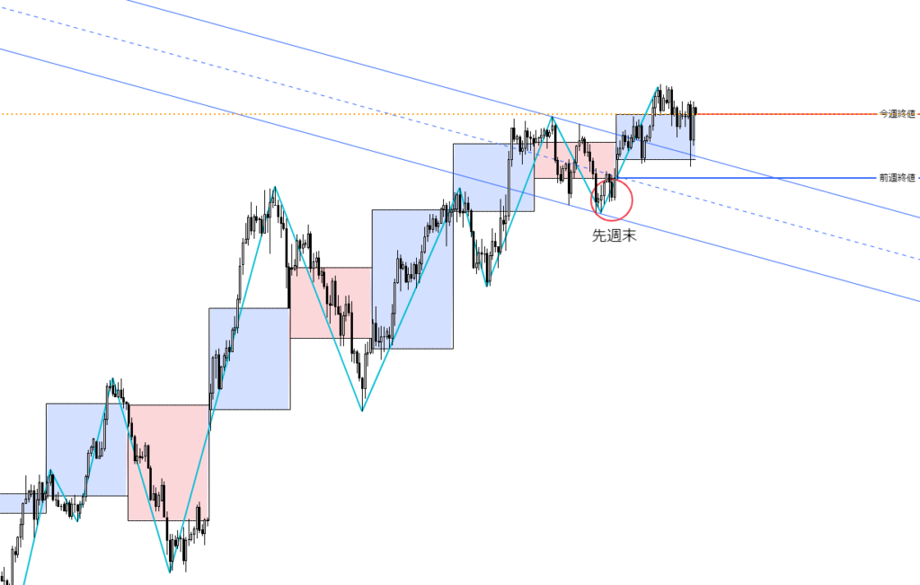 日足チャートに「ZigZag」インジケーターを表示し、安値を赤色、高値を青色で示しています。今週は調整の一週間となりました。