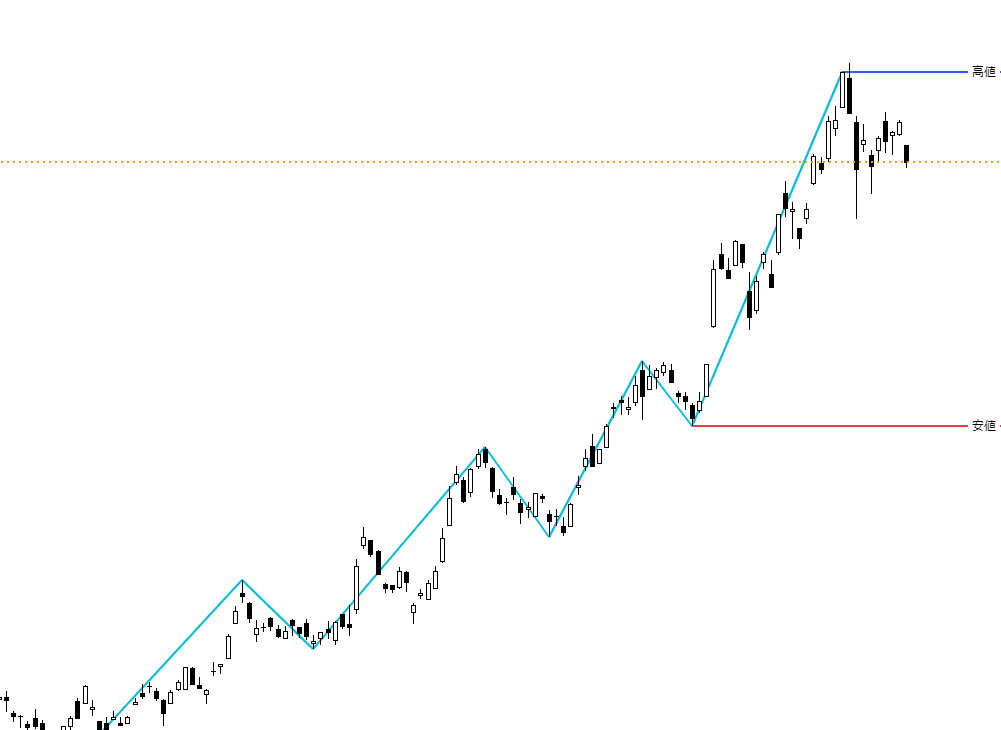 こちらの指数は終値ベースで高値更新しました。「ZigZag」では安値も切り上がっています。