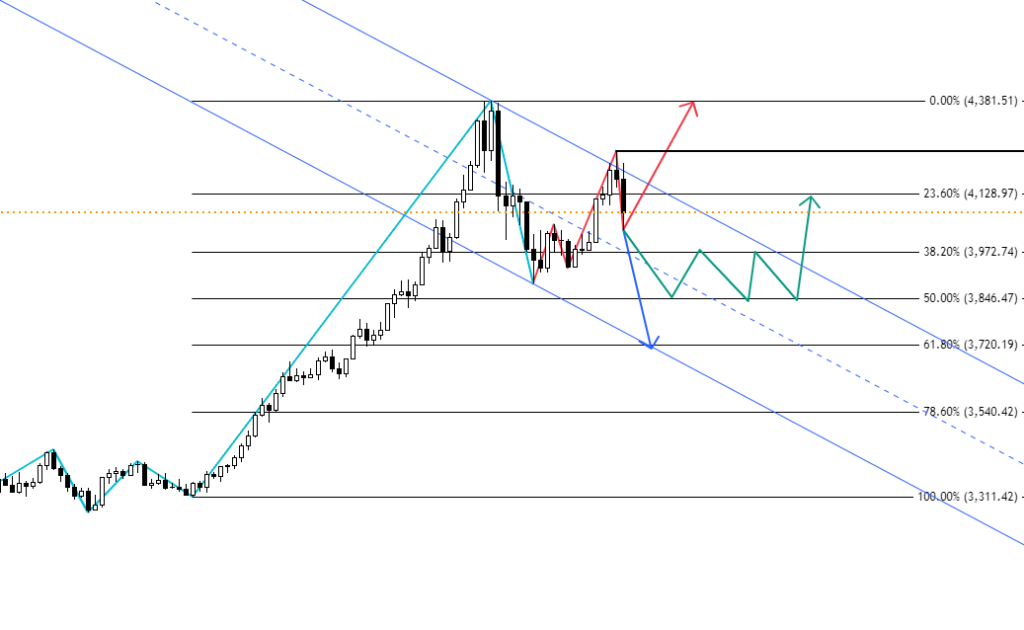 また、これまで強い買い圧力が感じられていたため、緑のラインのように半値ラインを軸に長期間のレンジを形成する可能性も考えられます。