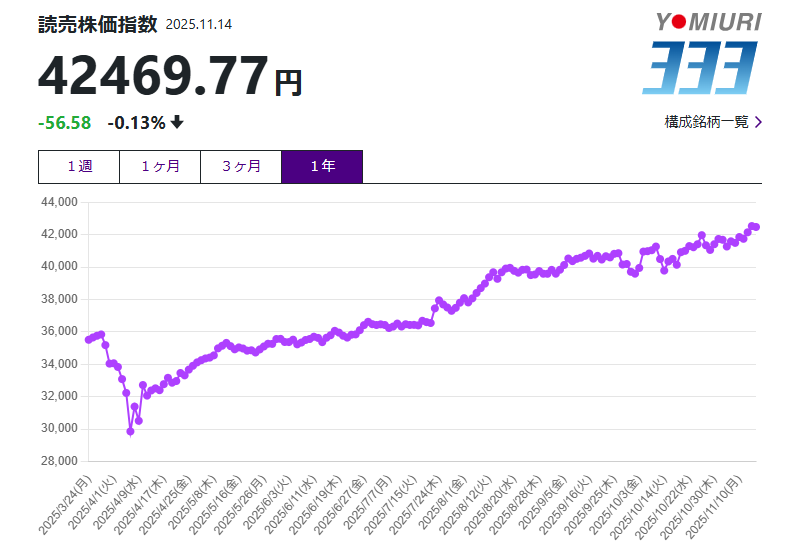 今週の「読売333」は日経平均に比べるとボラティリティは無く、安定しながら高値更新しています。
