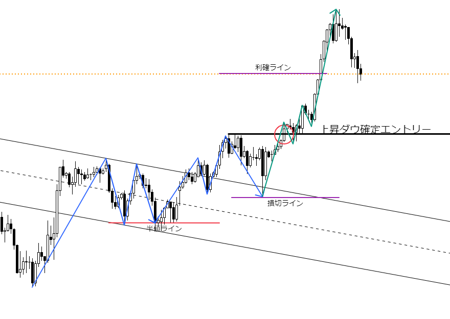 黒太線の上昇ダウ確定ラインを超えた陽線終値でエントリー。損切は下降方向感が復活するであろうチャネル内安値に設定しました。