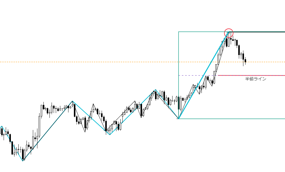緑波形の2回目の上昇ダウで損切位置をエントリーラインより上にしたので負けないトレードにはなっていました。今後は、利確ラインで分割決済して延ばせるところまで追っていくようなトレードがしたいです。