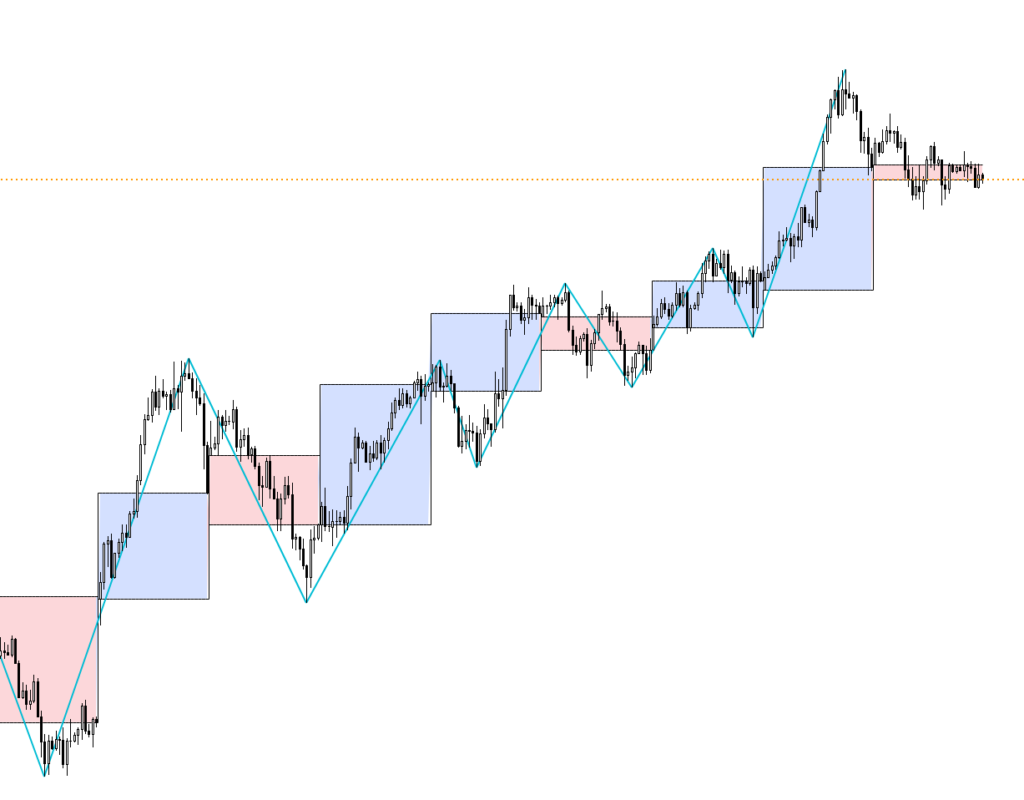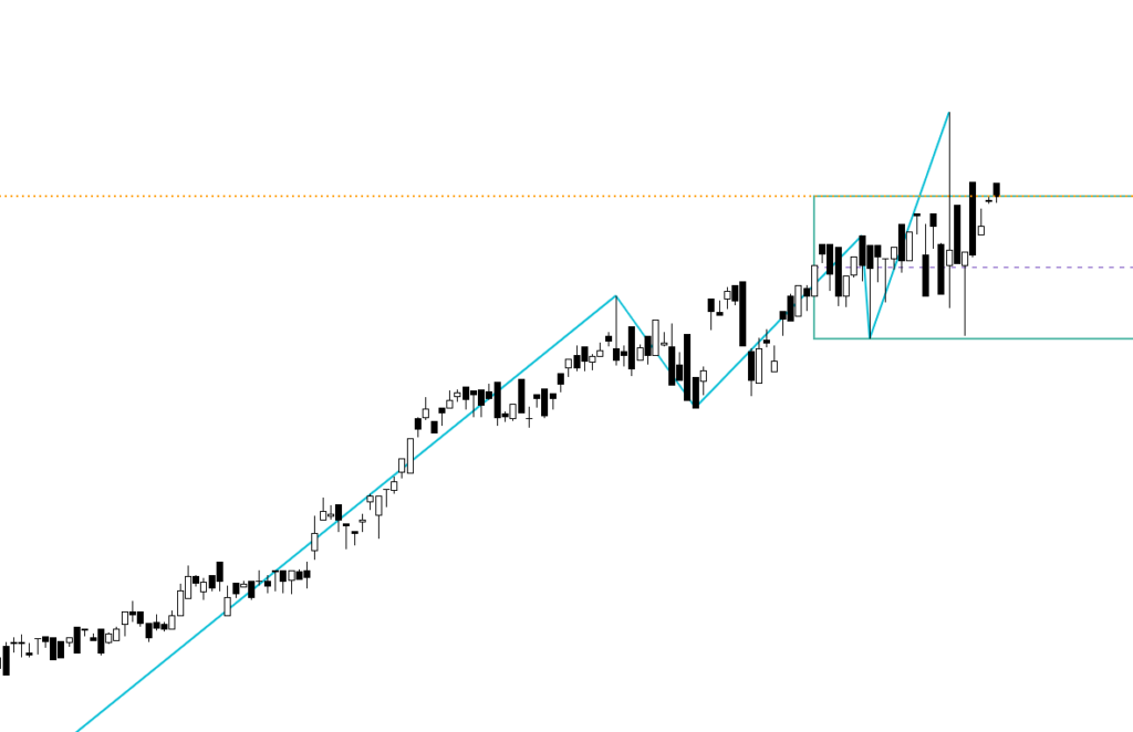 ZigZagでは長い上ヒゲに高値が描画されていますが、下位足で確認すると、これは数分間の動きに過ぎなかったため、ノイズと判断してカウントしませんでした。ただし、金曜日には終値ベースで先週の高値を更新しています。