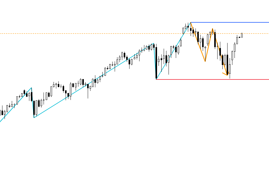 水色の波形はZigZagで描画されたものです。先週は下降ダウのようにも見えたため、オレンジ色の波形を描いていました。さらに、点線2本を下抜けたことで、本格的な下降トレンドが形成されるのでは?と警戒していました。