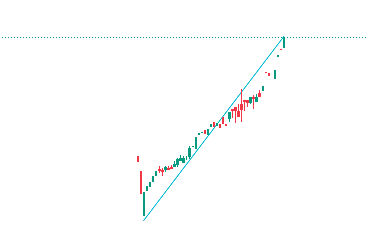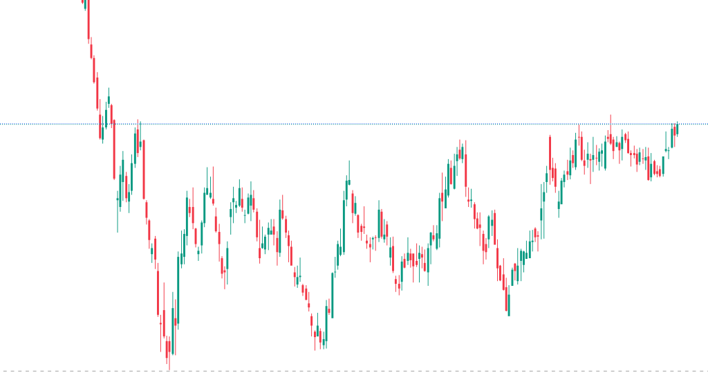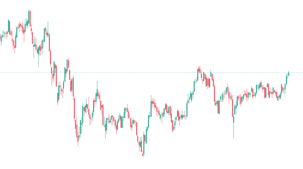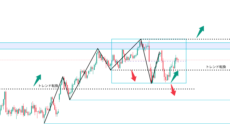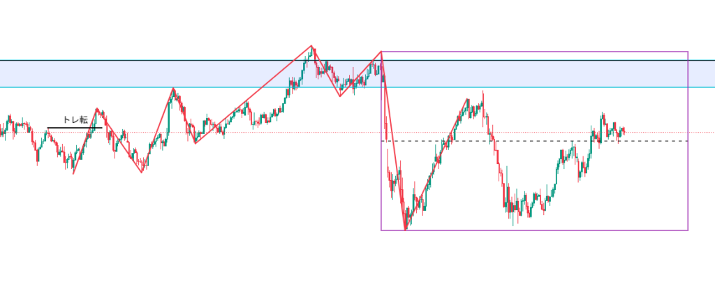 一方で、水色ボックスを下抜けなら、次のターゲットになりそうな上昇トレンド転換の境界になった点線での反応を確認します。