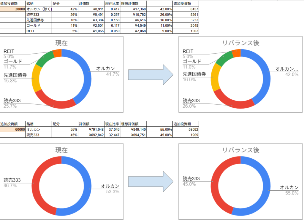 また、別のシートではリバランス用の計算式を入力しており、「いくら分購入すればよいか」「どれだけ売却すればよいか」も自動で計算されるようにしています。