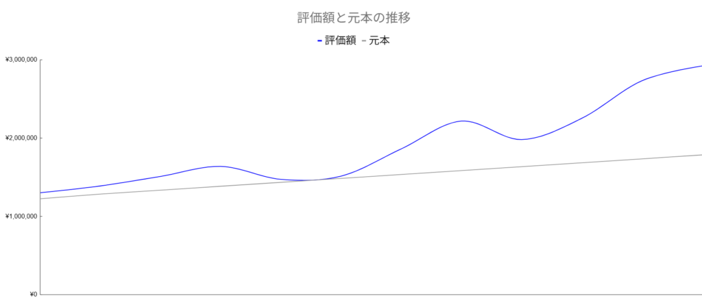 資産の推移についても折れ線グラフで作成しており、元本との比較から現在の運用状況を簡単に確認できます。