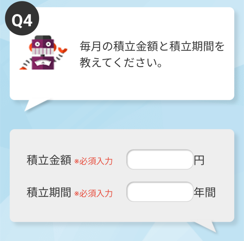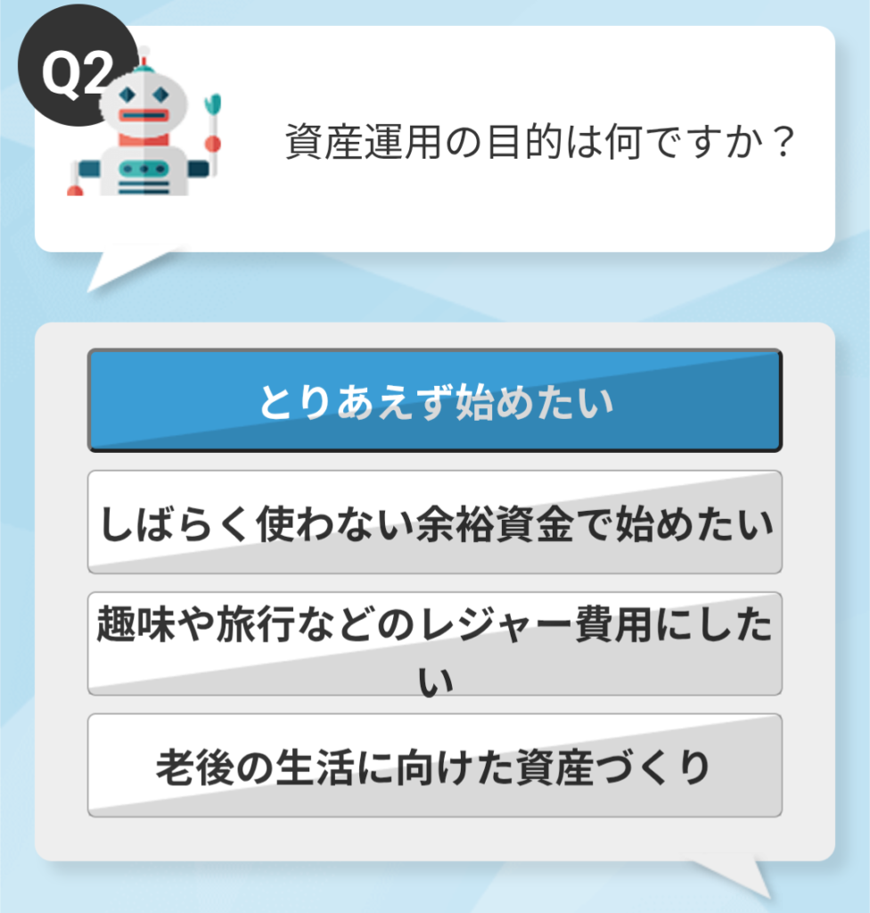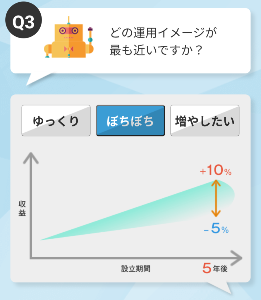 「かんたん積立アプリ」では、5つの簡単な質問に答えるだけで、自分の積立スタイルを診断してくれます。