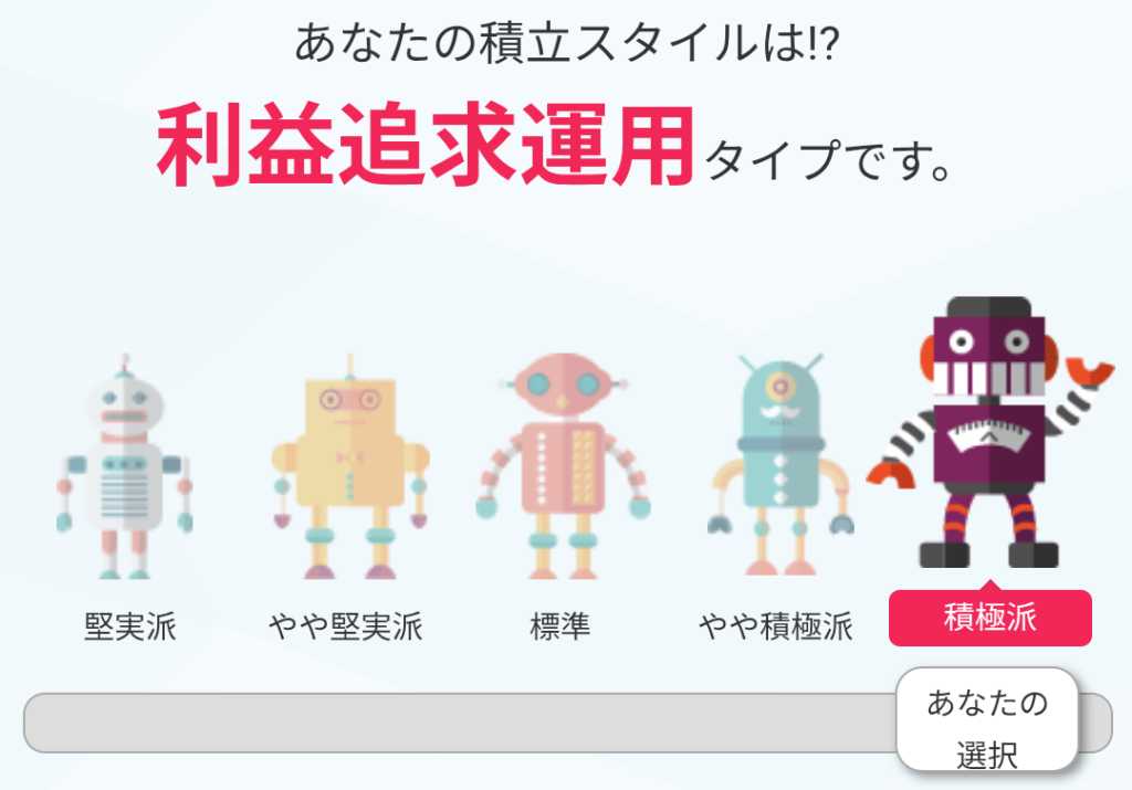 診断結果は、「堅実派」「やや堅実派」「標準」「やや積極派」「積極派」の5つのタイプに分かれていて、自分のリスクのとらえ方に合ったスタイルがわかる仕組みになっています。