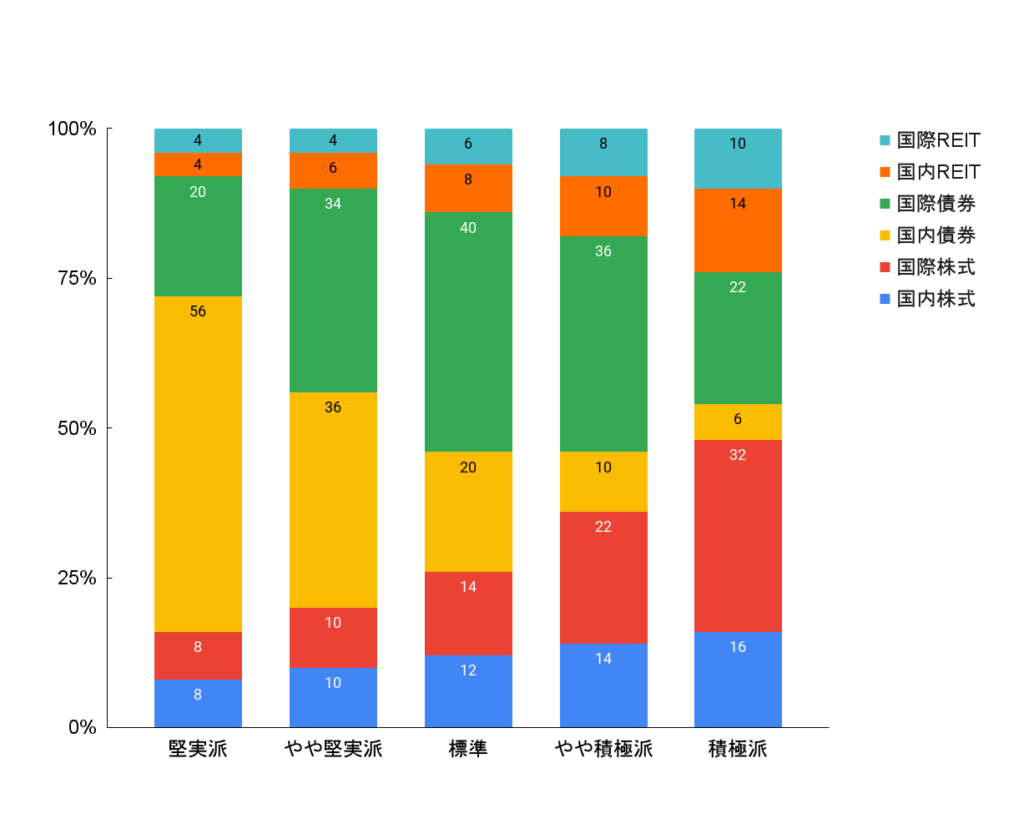 | 堅実派 | やや堅実派 | 標準 | やや積極派 | 積極派 | |